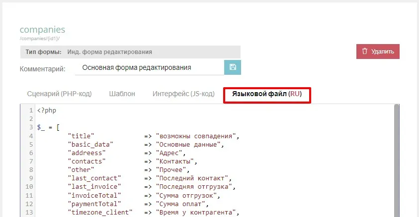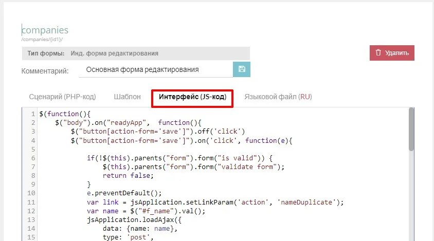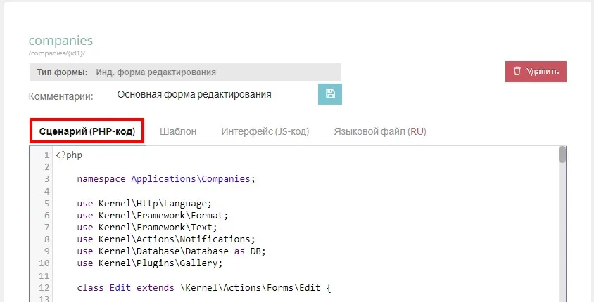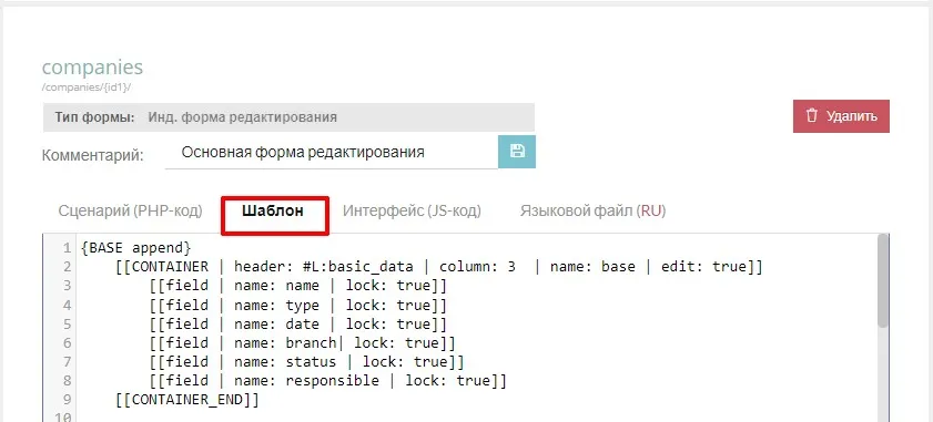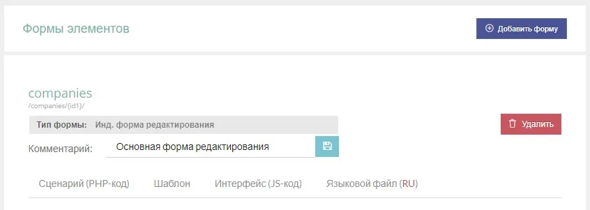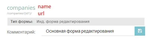 Форма имеет обязательное название (companies), а также адрес (URL), по которой форма будет доступна пользователю (/companies/{id1}/). Вместо {id1} Система автоматически подставит ID элемента. После создания формы изменить ее имя уже нельзя (нужно пересоздать).