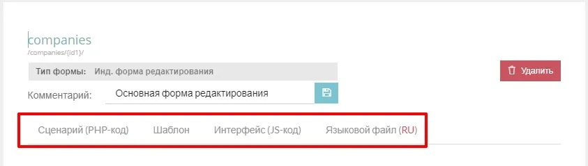 Форма имеет обязательное название (companies), а также адрес (URL), по которой форма будет доступна пользователю (/companies/{id1}/). Вместо {id1} Система автоматически подставит ID элемента. После создания формы изменить ее имя уже нельзя (нужно пересоздать).