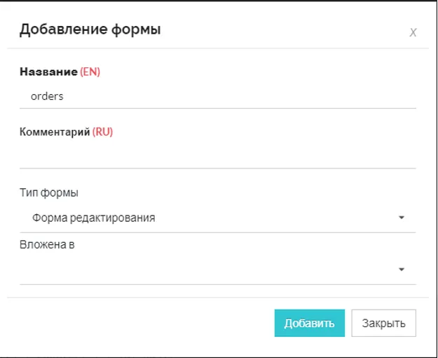 - Название (EN) — название формы всегда на английском языке в нижнем регистре. Обычно совпадает с названием объекта (если одна форма редактирования у Объекта).