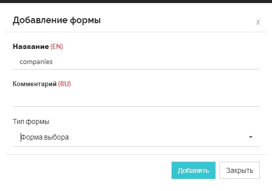 «Форма выбора» используется для выбора одного “Объекта”. Целесообразно создавать форму выбора, а не просто добавлять поле типа select (выпадающий список), если количество выбираемых объектов в списке больше 20 и при выборе «Объекта» необходимо использовать фильтр.