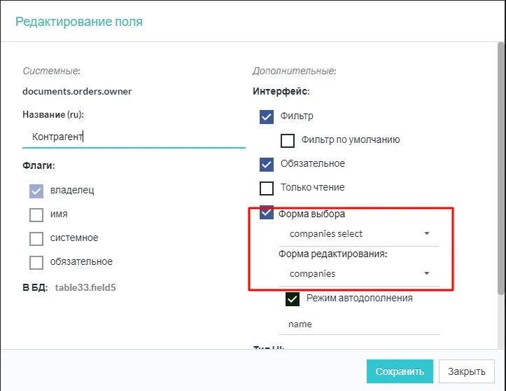 В модуле “Счет” добавляем поле “Контрагент” и выбираем “Форму выбора” и “Форму редактирования” объекта «Контрагенты».