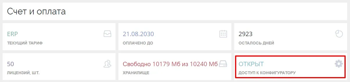 Обращаем внимание. что но бесплатном тарифе нет доступа в модуль «Конфигуратор».