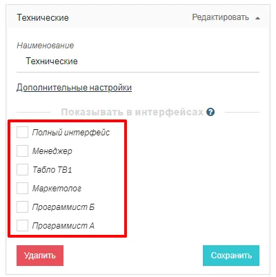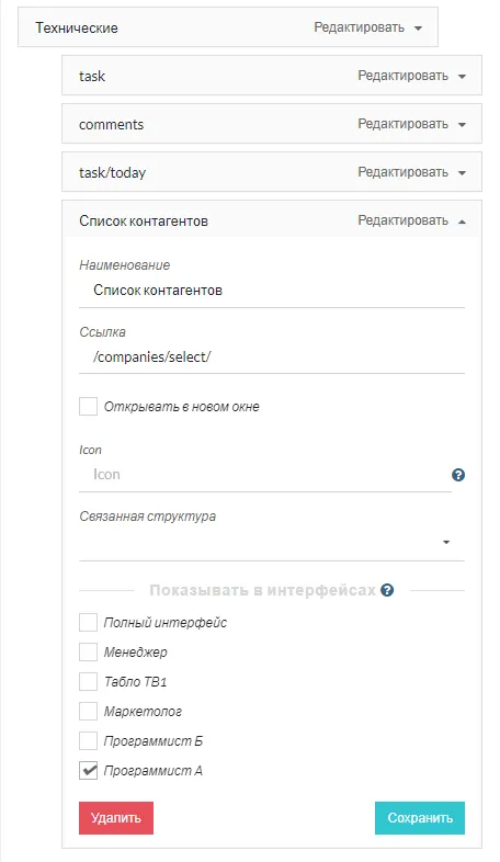 Важно! Если снять галочки со всех «Интерфейсов», то элемент меню будет показываться у всех пользователей. Это сделано для совместимости с модулем экспорта/импорта конфигураций Системы.