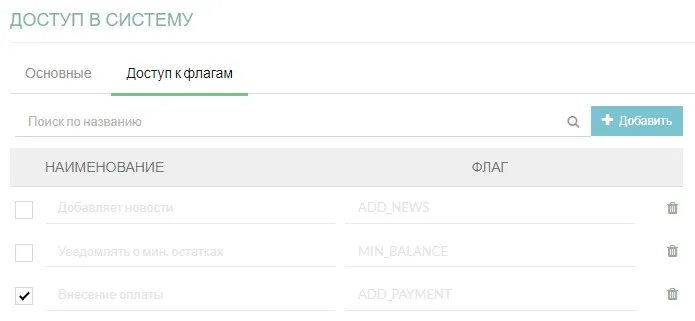 Наличие «Флагов» позволяют разработчику гибко управлять бизнес-логикой в «PHP-сценарии». Например, если у пользователя стоит флаг «ADD_PAYMENT», то у него доступна кнопка в счете «Внесение оплаты».