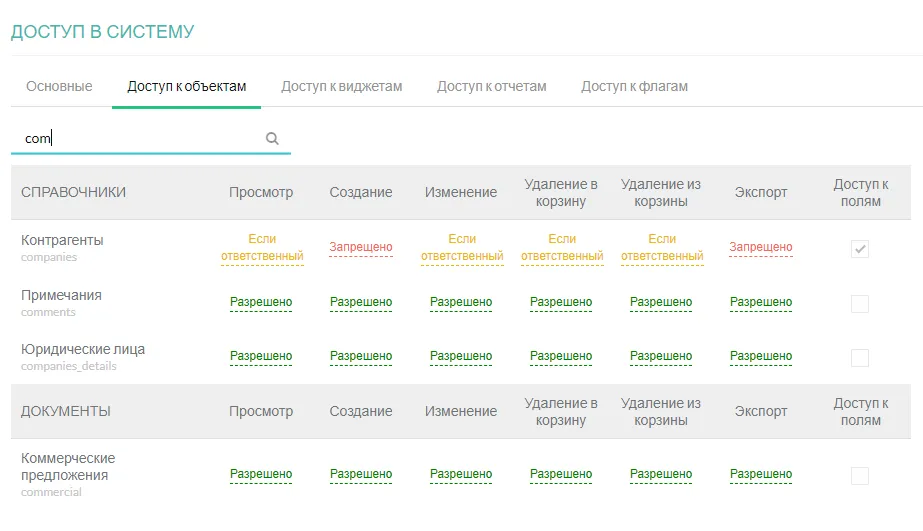 «Доступ к объектам» имеет удобный интерактивный поиск по названию (RU, EN). Доступ можно настроить только к «Справочникам» и «Документам».
