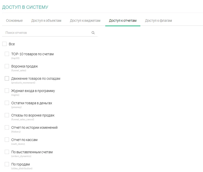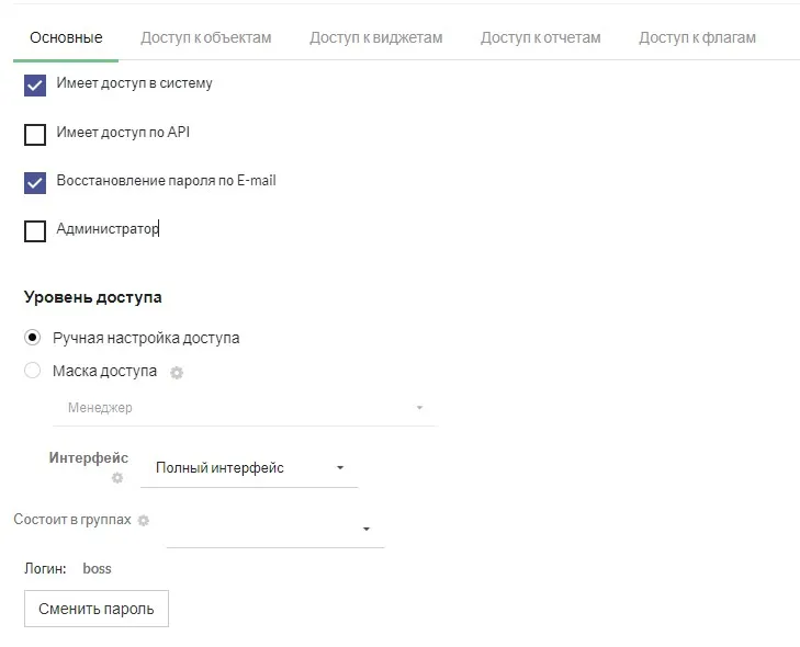 Настраивается доступ пользователей к отчетам (раздел «Аналитика»).