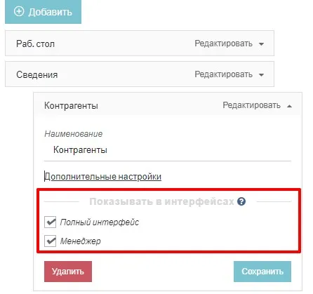 От выбранного «Интерфейса» зависит, какие разделы будут доступны пользователю. Настройка интерфейсов происходит в меню «Настройки» — «Настройка меню».