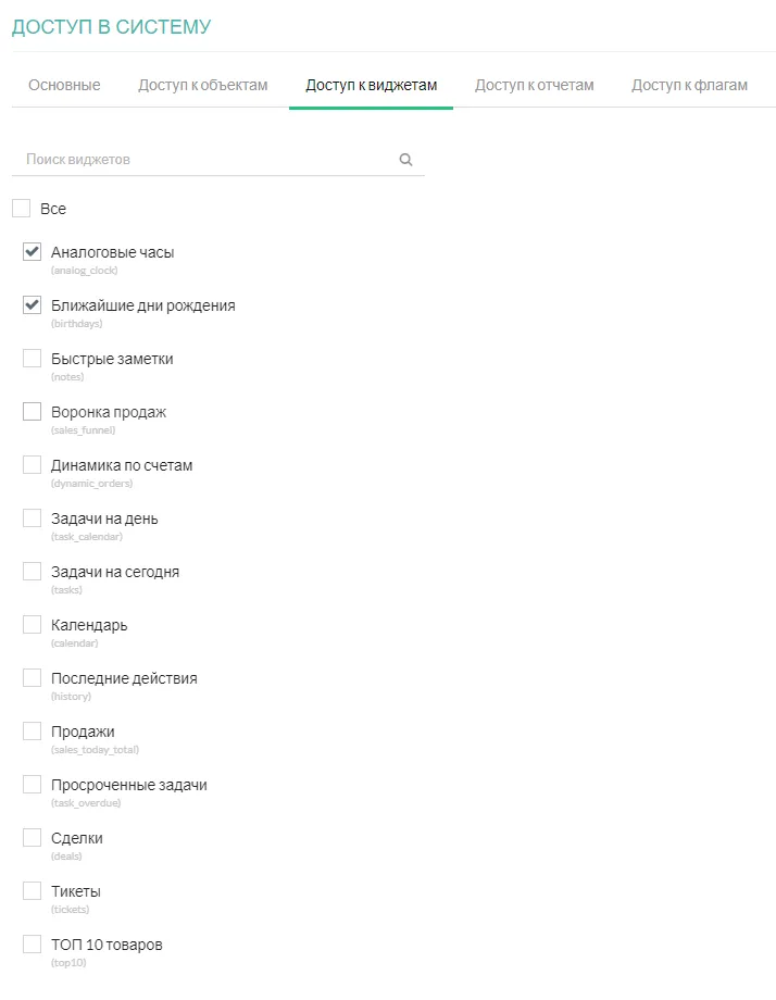 Важно! Изменение доступа к виджетам пользователя никак не отражается на количестве активных виджетов на его «Рабочем столе». Нужно пользователю зайти на своем «Рабочем столе» в меню «Виджетов» и указать галочкой новый виджет.