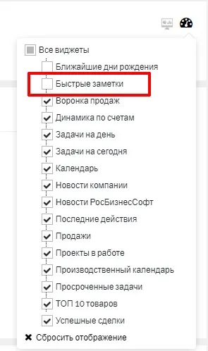 Важно! Изменение доступа к виджетам пользователя никак не отражается на количестве активных виджетов на его «Рабочем столе». Нужно пользователю зайти на своем «Рабочем столе» в меню «Виджетов» и указать галочкой новый виджет.