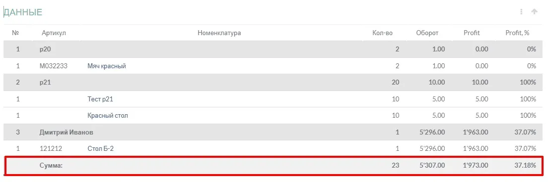 Для суммирования используется функция sumData(). Она добавляет строку в конец отчёта.