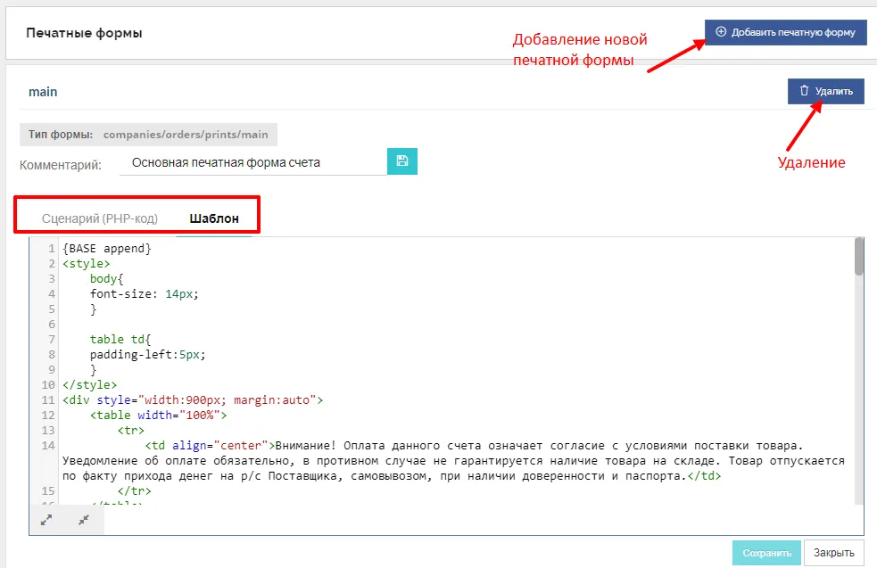 «Печатная форма» состоит из 2 закладок “Сценарий” и “Шаблон”. В шаблоне используется HTML верстка документа.