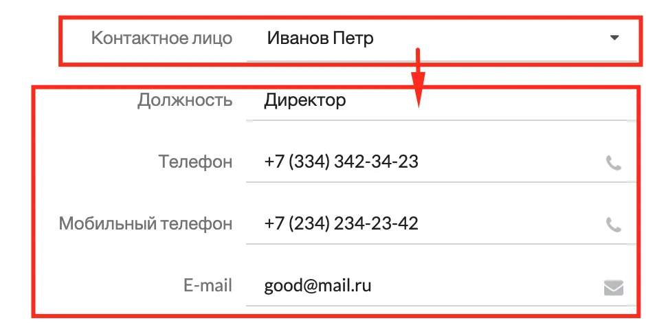 При выборе «Контактного лица» автоматически подставляются на форму его «вложенные» поля