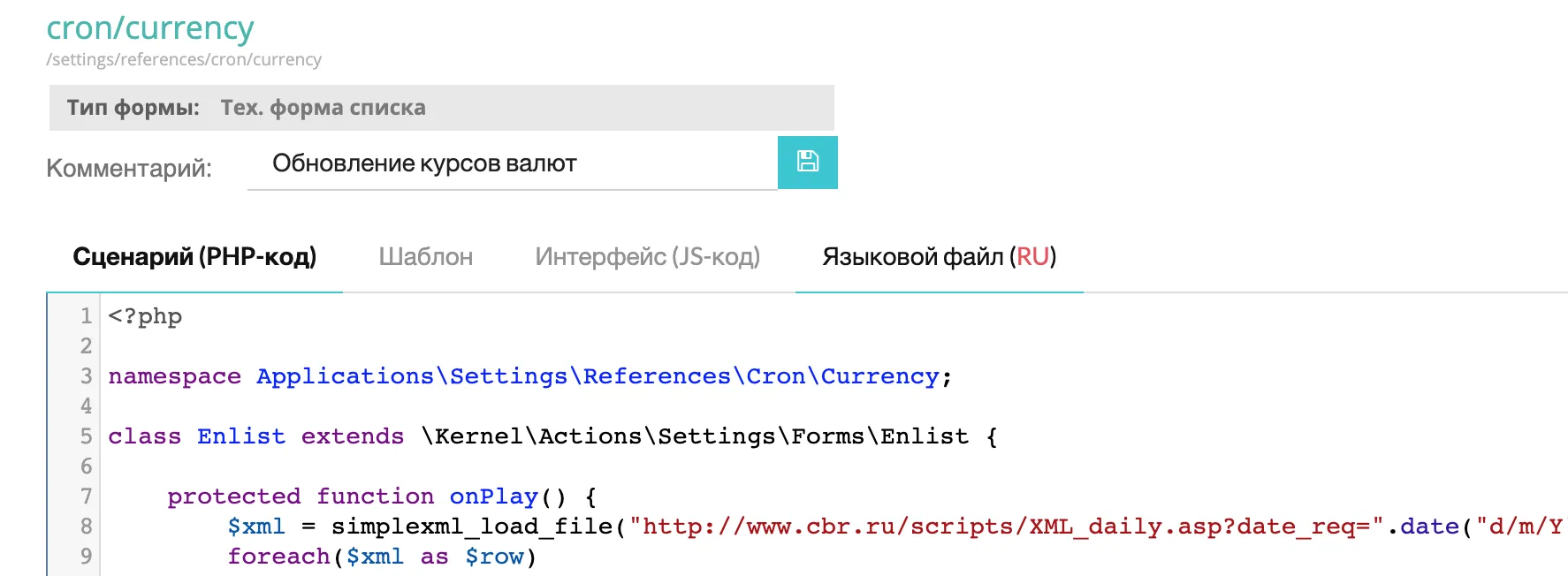 Новые CRON-задания создаются в «Конфигураторе» в модуле «Cron» (/configurator/references.cron/) и автоматически отображаются в плагине.