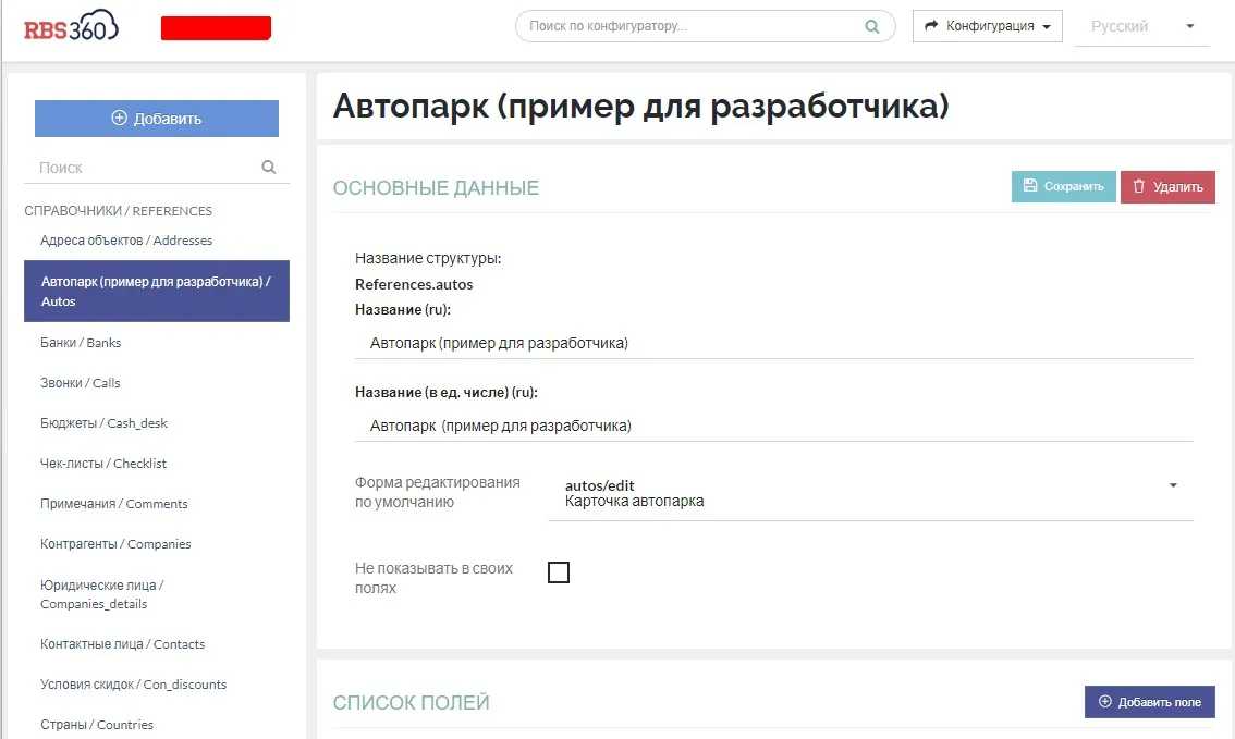 В целях быстрого знакомства с модулем «Конфигуратор» вендор добавил учебный объект «Автопарк (пример для разработчика)».
