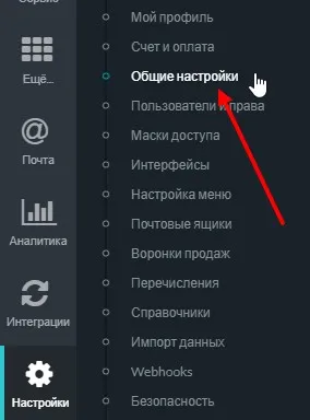 Необходимо зайти в левом меню в раздел «Настройки» -> «Общие настройки» (раздел «Настройки» доступен только для пользователя с правами «Администратора»).