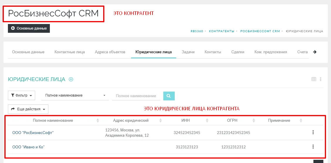 «Контрагенты» — это компании, в которых работают люди (справочник «Контактные лица»). Также с «Контрагентом» связан модуль «Контакты» (состоявшиеся события с «Контрагентом», например звонок). Если запланировано какое-то событие, то это модуль «Задачи» (с контрагентом). Также к «Контрагенту» относятся «Сделки» и т. д. Если взаимоотношения с клиентом выходят на этап подписания «Договора» (отправки «Счета»), то добавляется новая сущность «Юридическое лицо».