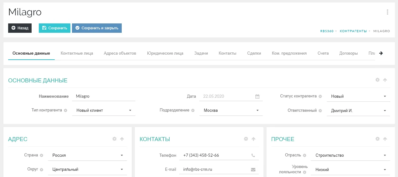 - «Панель управления» — функциональные кнопки управления. Во всех карточках есть кнопка «Назад» (переход в общий список «Контрагентов» на первую страницу без учета фильтра). Если Вам нужно вернуться обратно на одну страницу назад (например, на страницу «Контрагентов» с примененным фильтром»), то нужно нажать кнопку «Назад» в Вашем браузере или нажать соответствующее сочетание кнопок на клавиатуре. Также в панель могут быть добавлены любые функциональные кнопки, например «Отправить электронное письмо», «Создать Задачу», «Уведомить клиента» и т.д.