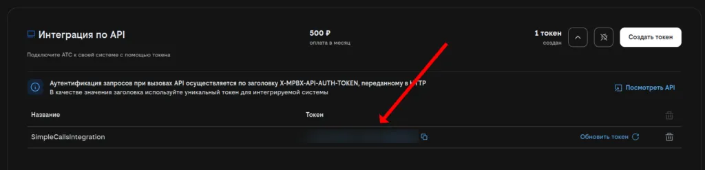 3. Прокрутите страницу вниз и из блока «Интеграция по API» скопируйте значение из поля «Токен»