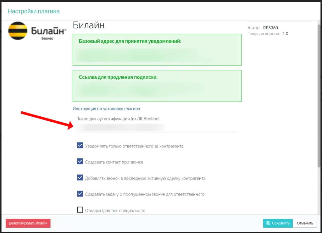 4. В настройках плагина вставьте скопированный Токен в поле «Токен для аутентификации (из ЛК Beeline)»