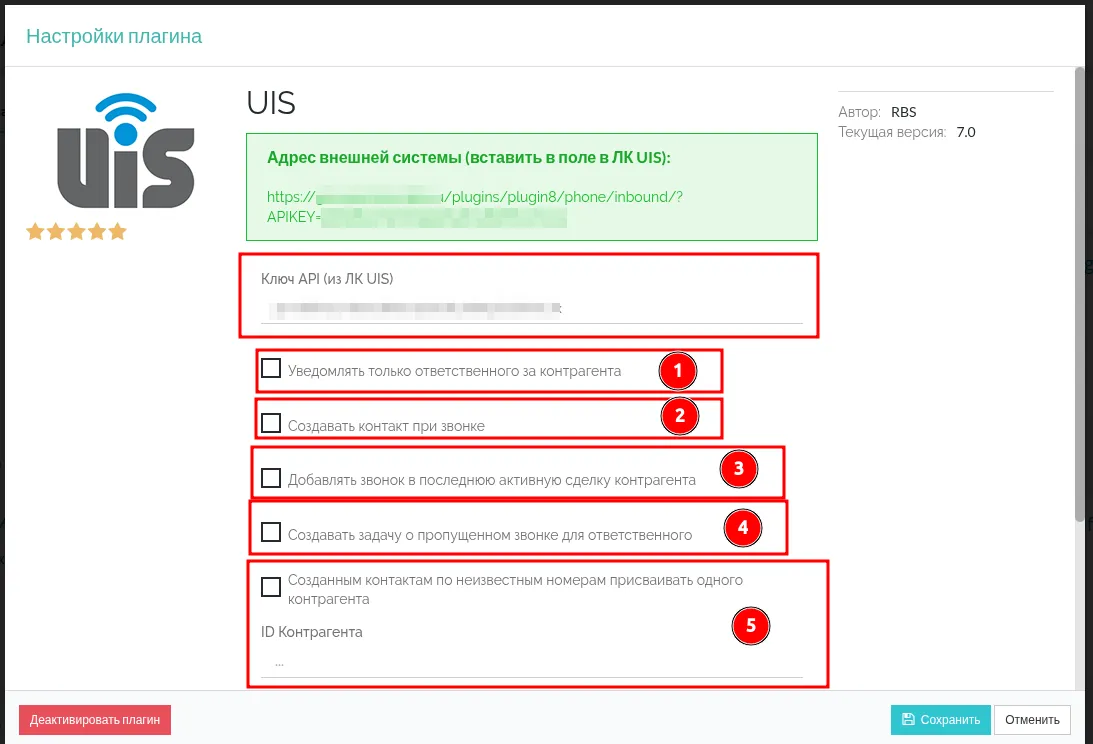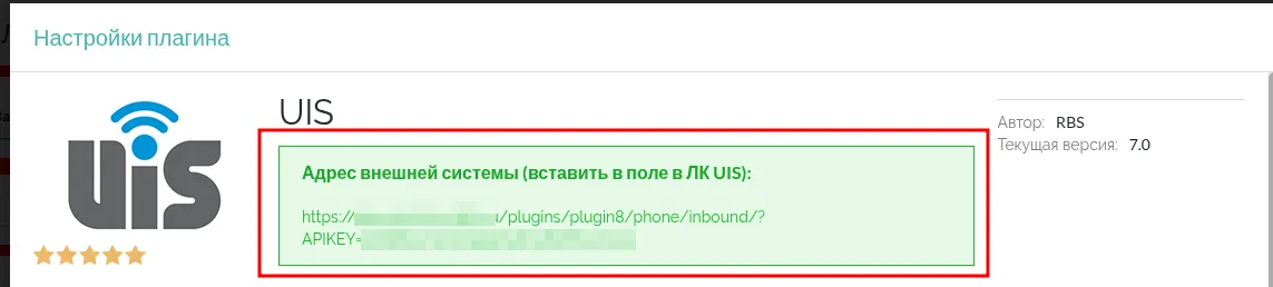 2.2. В модальном окне установки плагина заполните поле Ключ API (из ЛК UIS), Ключом API полученным при создании пользователя в личном кабинете UIS.
