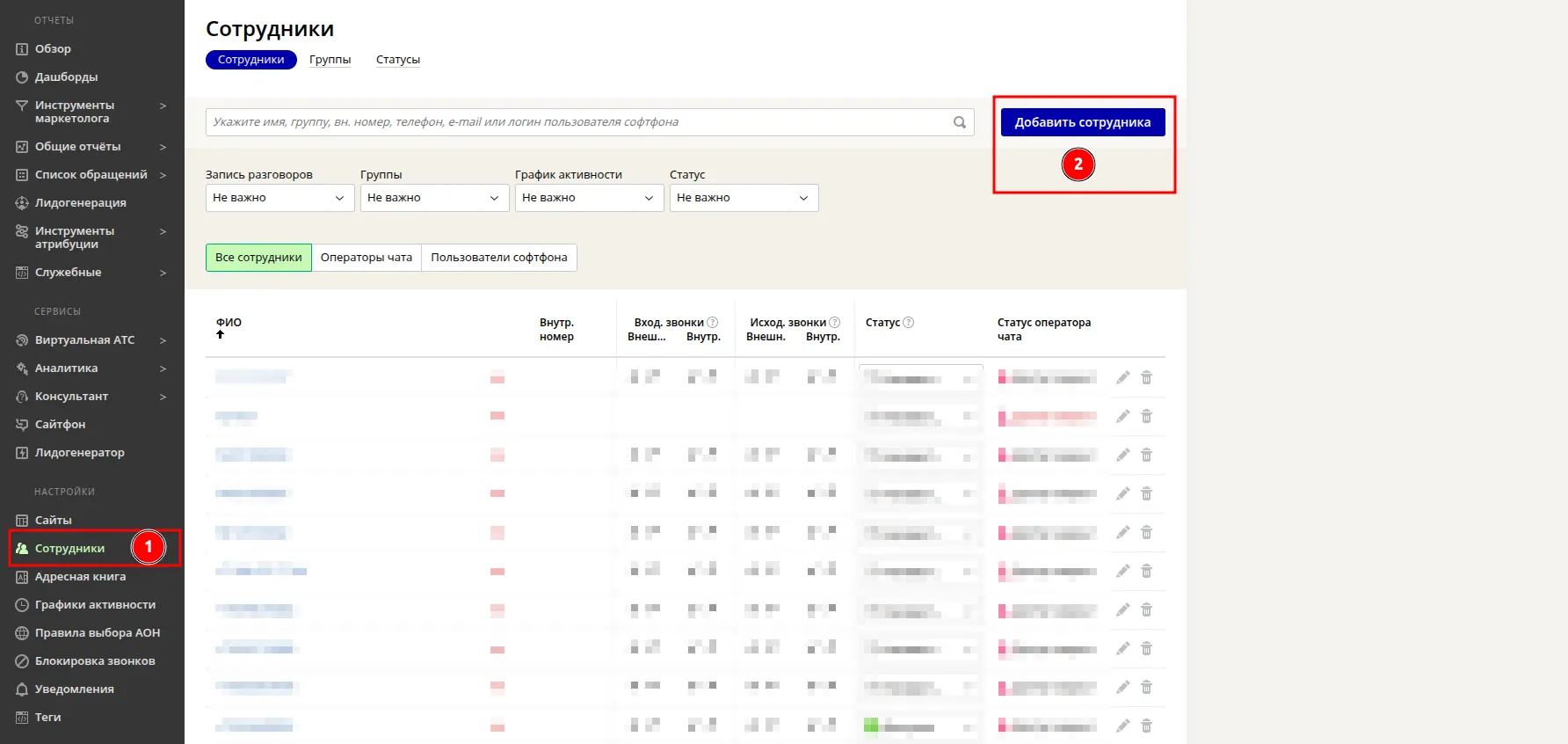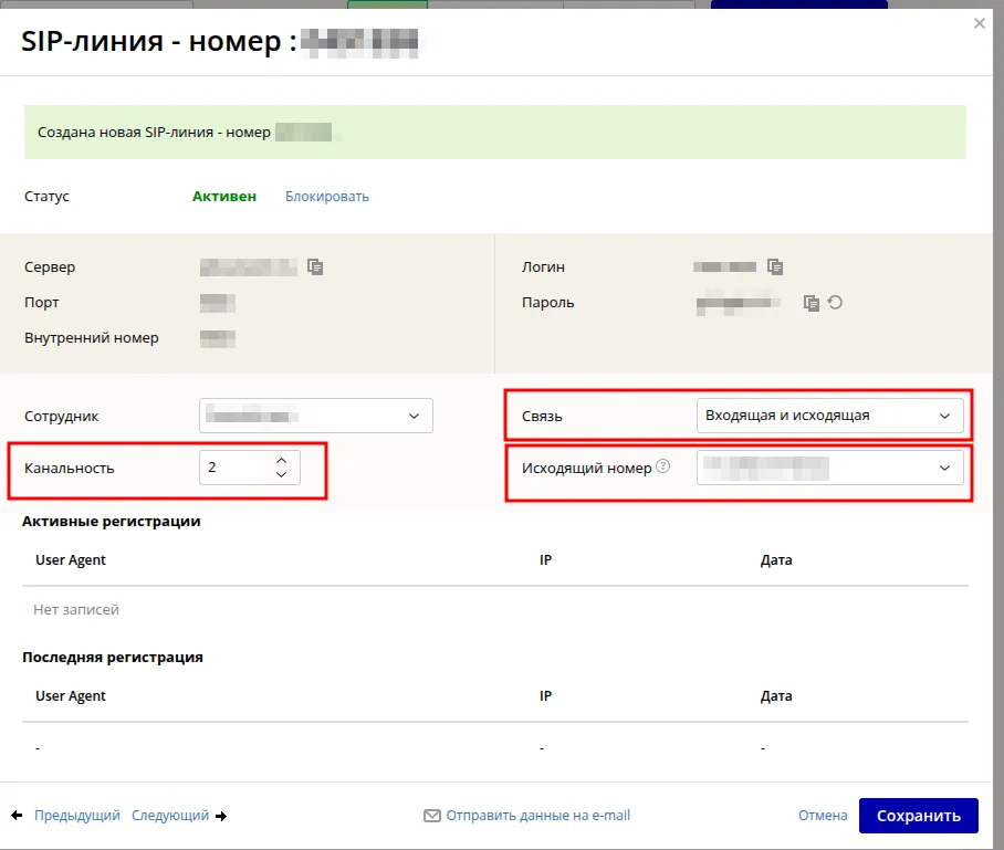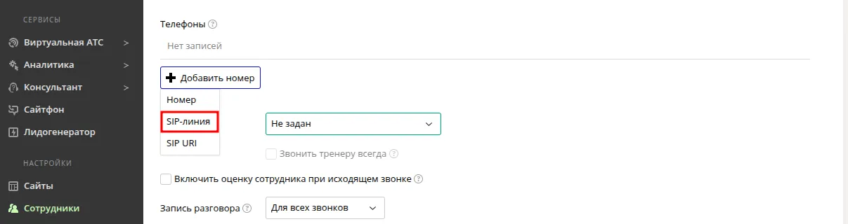 1.3. Создание, настройка сотрудника с привязкой к SIP-линии и виртуальному номеру.