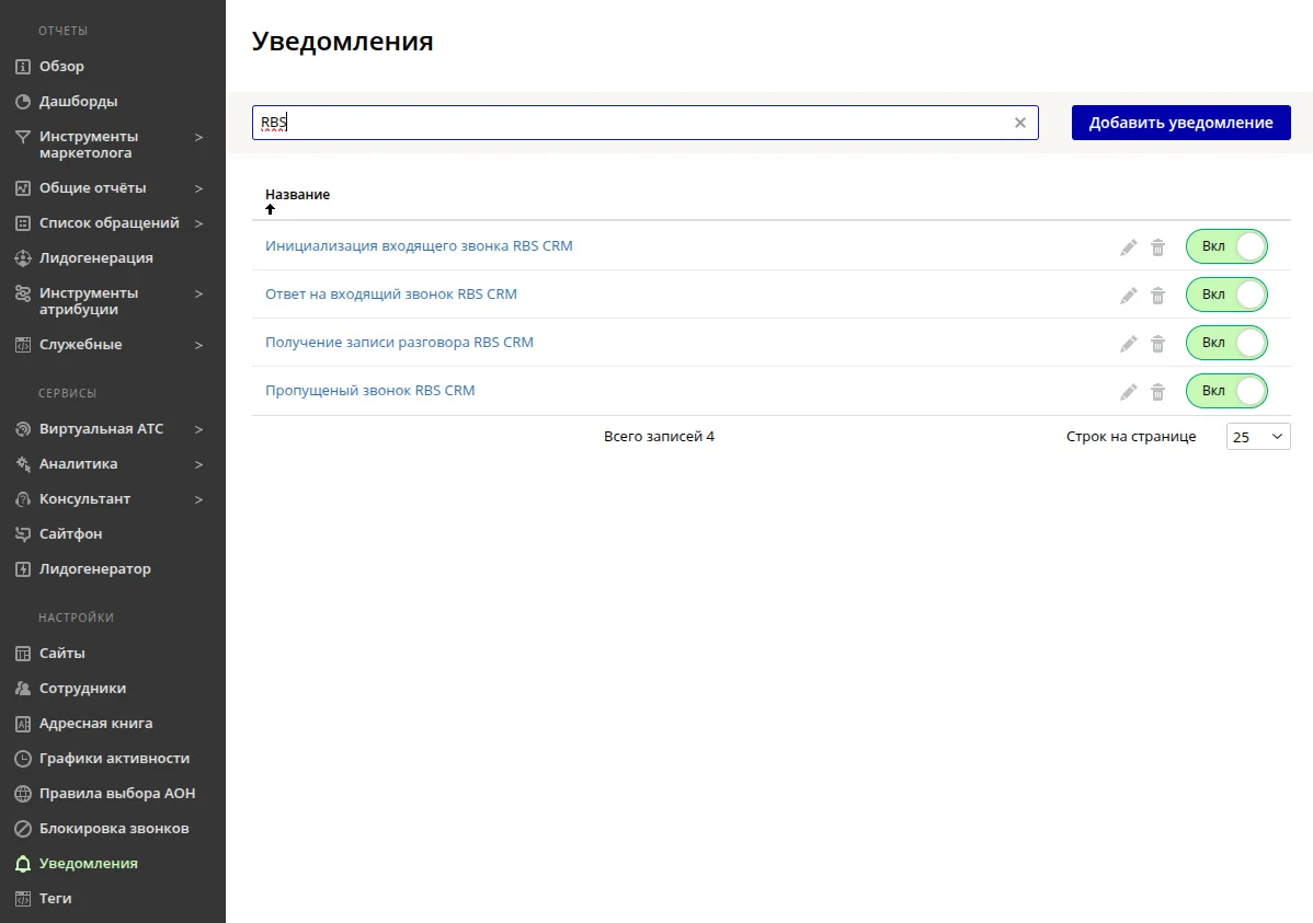 3.1. В личном кабинете UIS перейдите на вкладку «Уведомления», нажмите на «Добавить уведомление». Для корректной интеграции UIS потребуется создать 3 шаблона уведомлений, если выбрана настройка «Создавать задачу о пропущенном звонке для ответственного» добавляется еще один шаблон уведомлений.