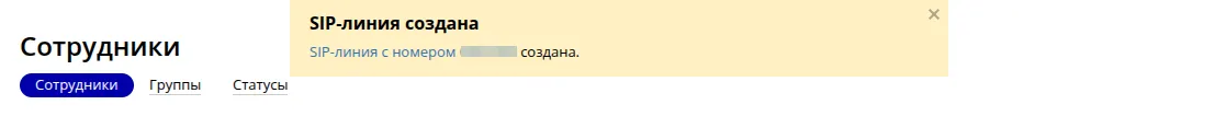 1.3.3. Сохраните карточку сотрудника. После сохранения UIS отображает уведомление о создании новой SIP-линии. Необходимо перейти по ссылке из уведомления.
