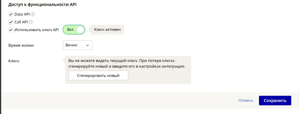 1.2.5. Определите Доступы к функциональности API пользователя. Выберите Использовать ключ API. Ключ API виден только при создании ключа, желательно сохранить этот ключ.