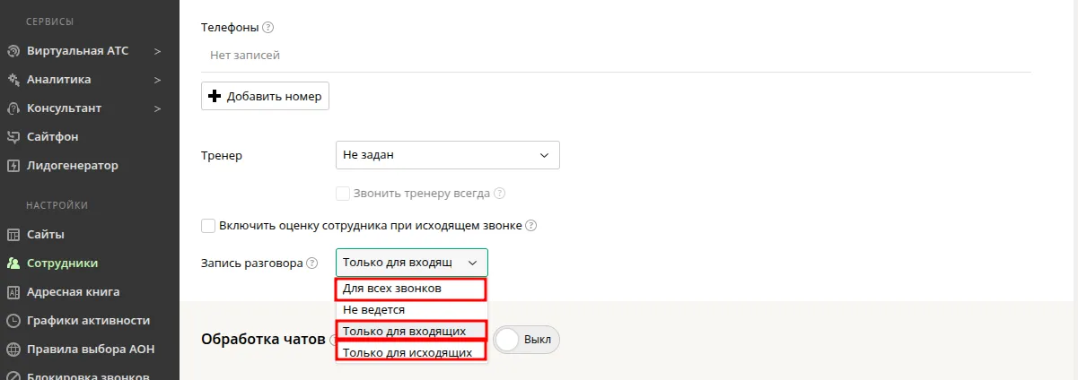 • Если Вам необходимо получать записи звонков выберите в поле «Запись разговора» значение «Для всех звонков», «Только для входящих», «Только для исходящих».
