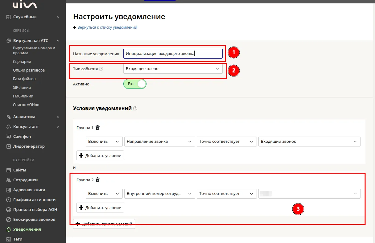 - Добавление условия/блоков условий при котором Виртуальная АТС UIS будет отправлять данные в CRM;