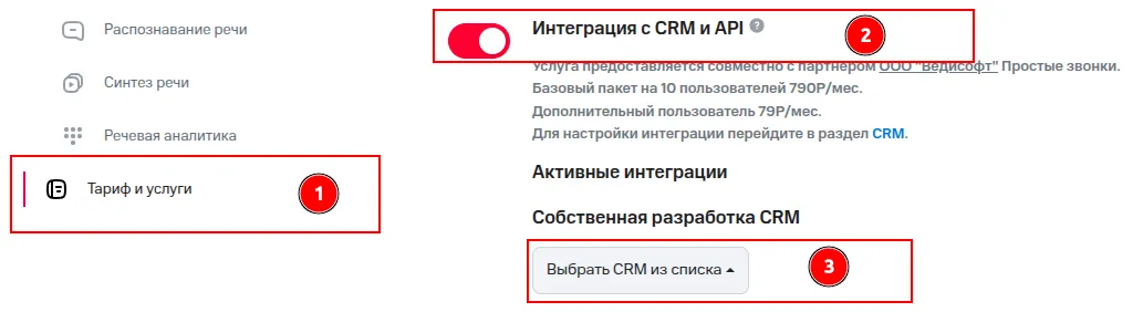 - Перейти на вкладку «Тариф и услуги», включить настройку «Интеграция с CRM и API» и в выпадающем списке выбрать «Собственная разработка CRM»