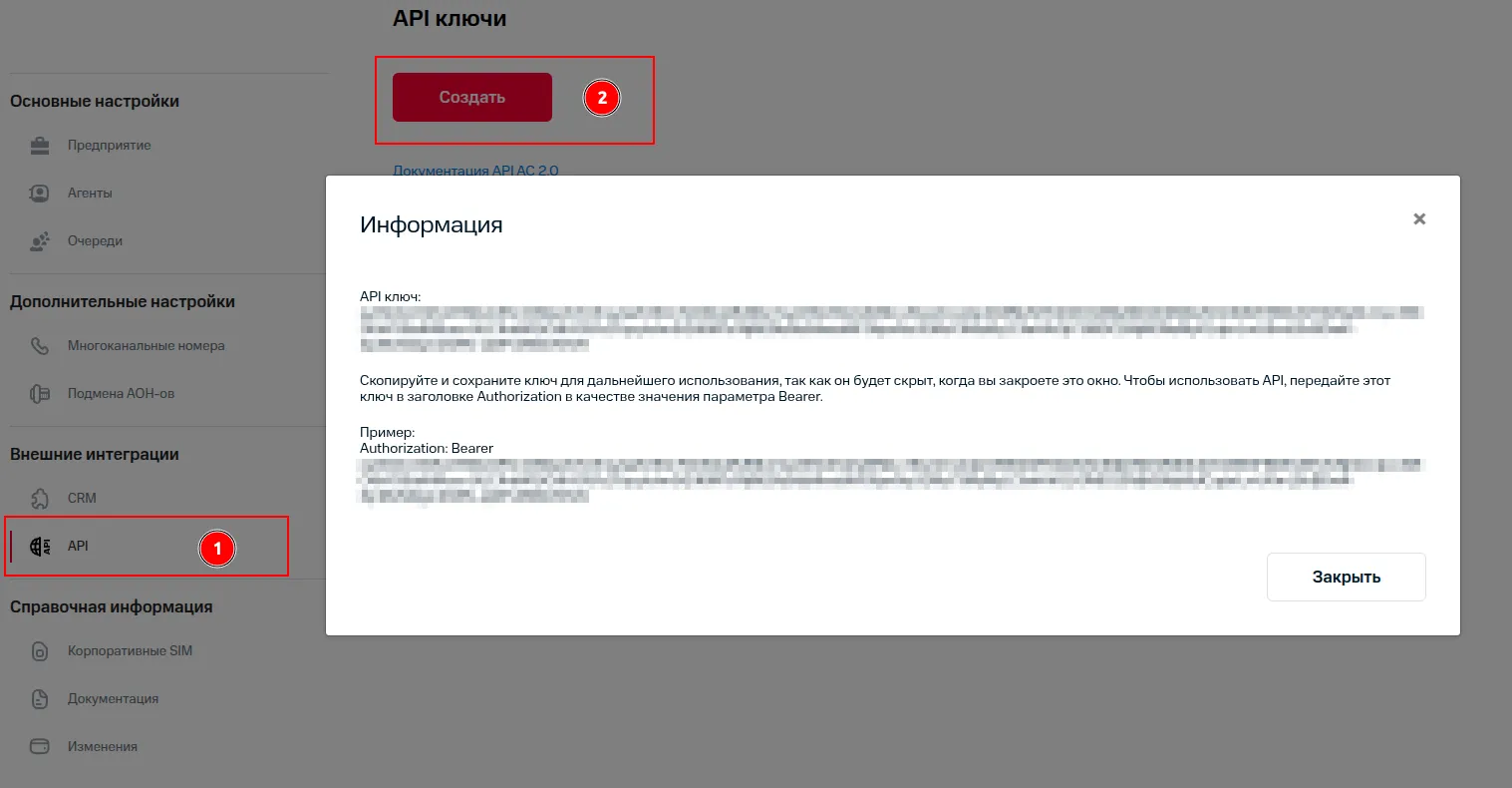 - В навигационном меню перейдите на вкладку «API», нажмите на кнопку «Создать» для создания API ключа взаимодействия системы RBS360 c МТС Автосекретарь. ВНИМАНИЕ!!! Рекомендуем не закрывать окно создания API ключа, так как ключ отображается только на момент создания.