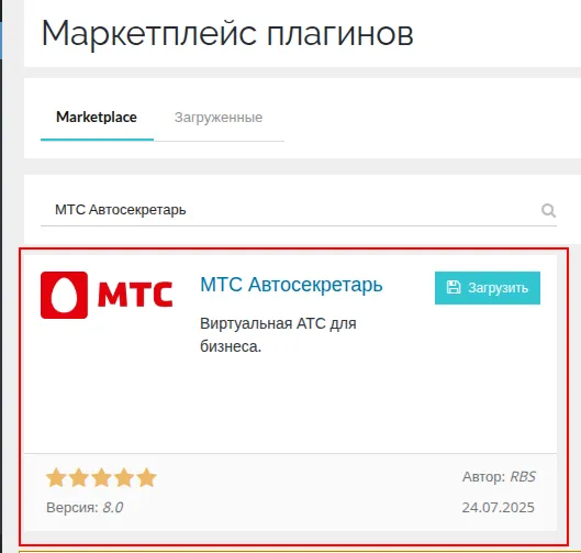 - В системе RBS360 перейдите на вкладку «RBSMarket» и установите плагин интеграции «МТС Автосекретарь»