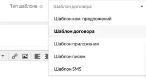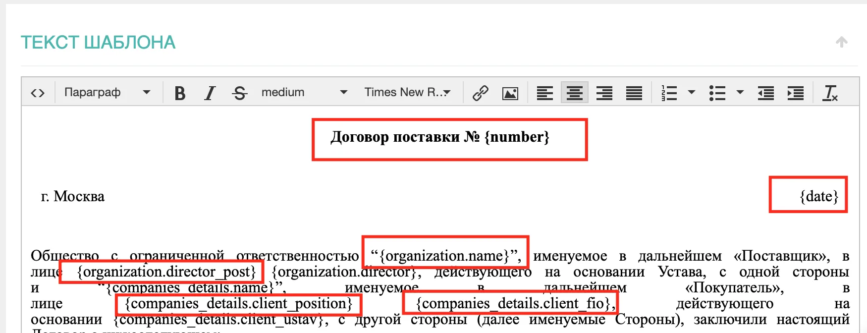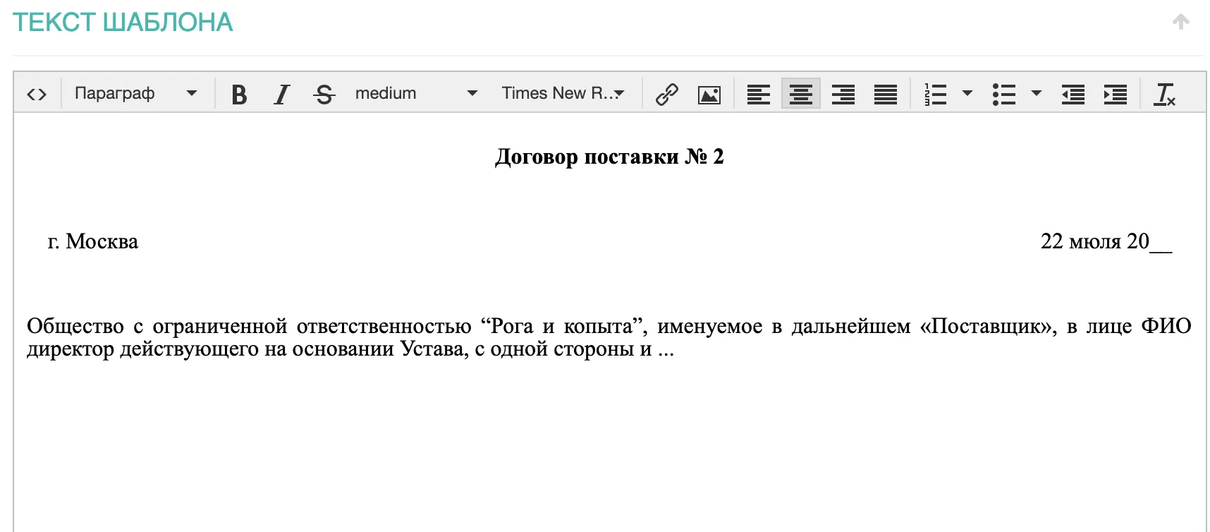 Далее в поле «Текст шаблона» вставляем проект шаблона «Договора».