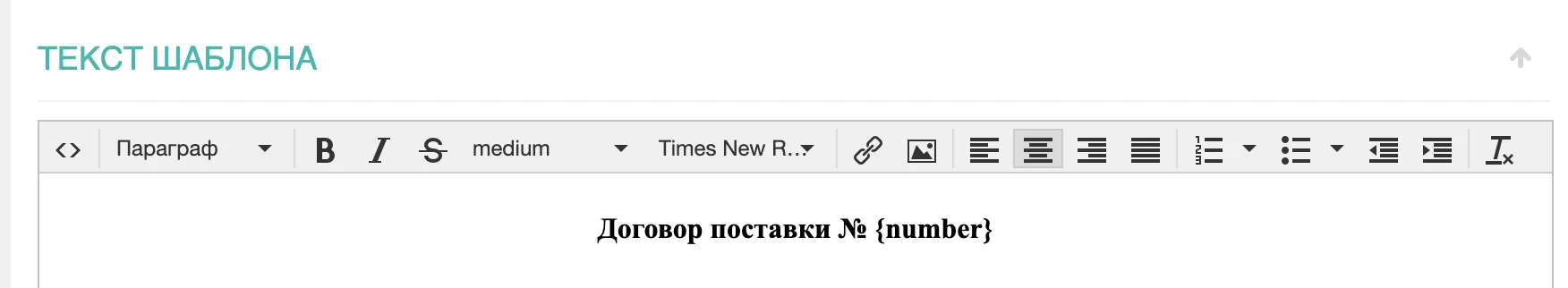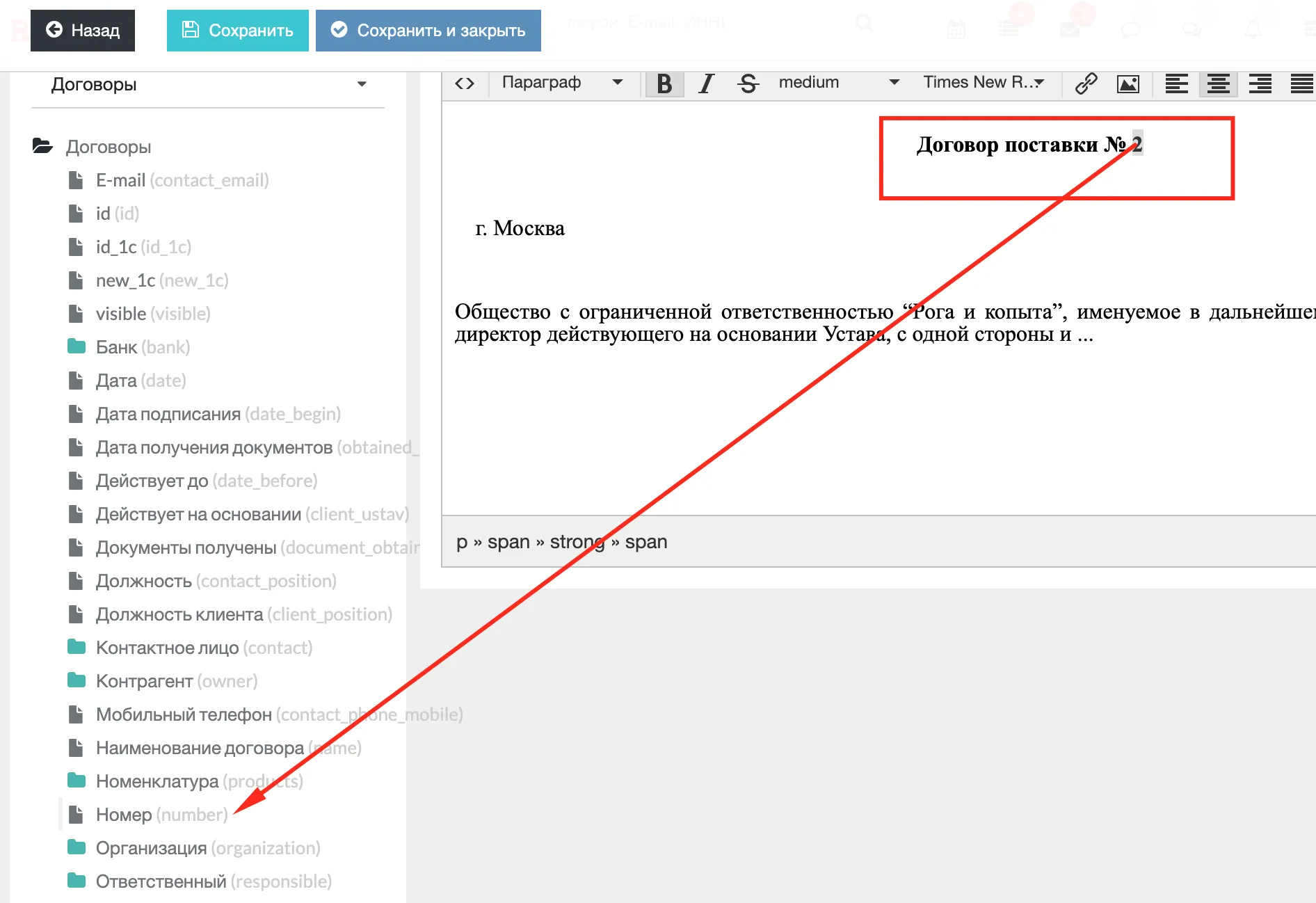 Далее заменяет текст договора на условные обозначения полей. Например, текст «Договор поставки №2» меняет на «Договор поставки № {number}». Для этого нужно выделить число «2» в «Тексте шаблона» и слева в «Списке полей» нажать на поле «Номер (number)».