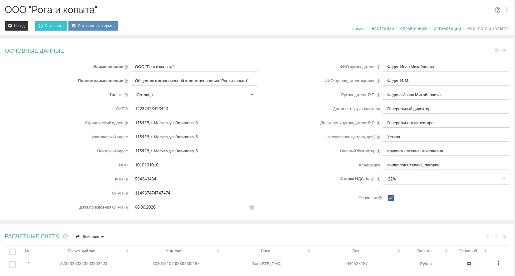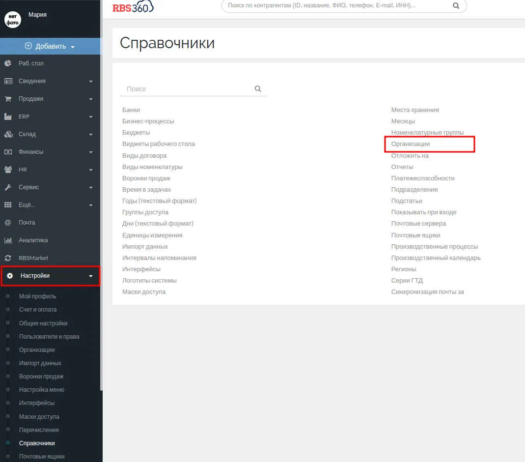Чтобы настроить свою организацию необходимо зайти в «Настройки» → «Справочники» → «Организации»: