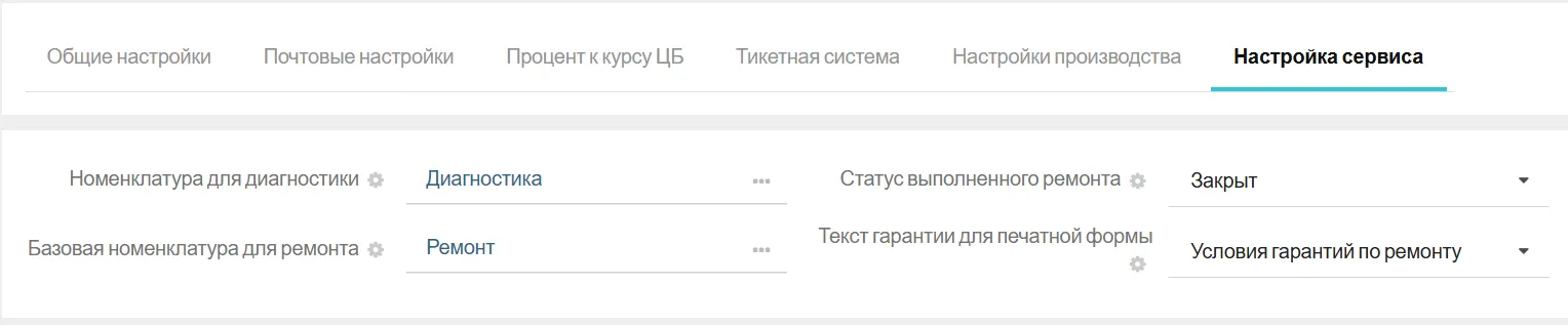 В «Настройках» — «Общие настройки» — вкладка «Настройки сервиса» вы можете задать основные настройки для работы сервисного блока.