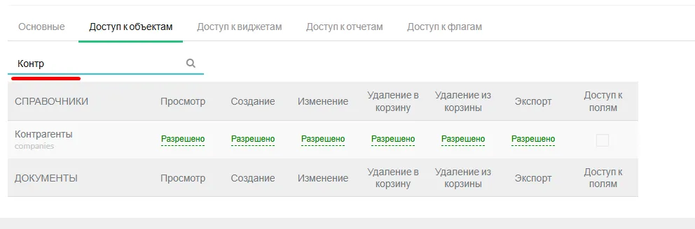 На вкладке «Доступ к объектам» открывается список объектов системы:
