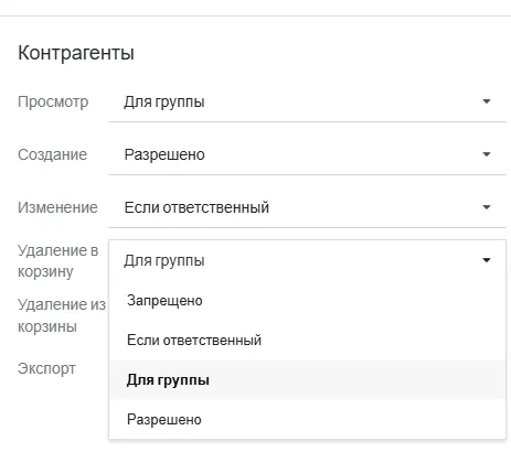 Пример, если Пользователь Иванов указан Ответственным за Контрагента «Ромашка», а пользователь Петров – за «Василек» и у них одна «Группа доступа», то Иванов будет иметь доступ к «Ромашке» и «Васильку», а Петров также к «Васильку» и «Ромашке».
