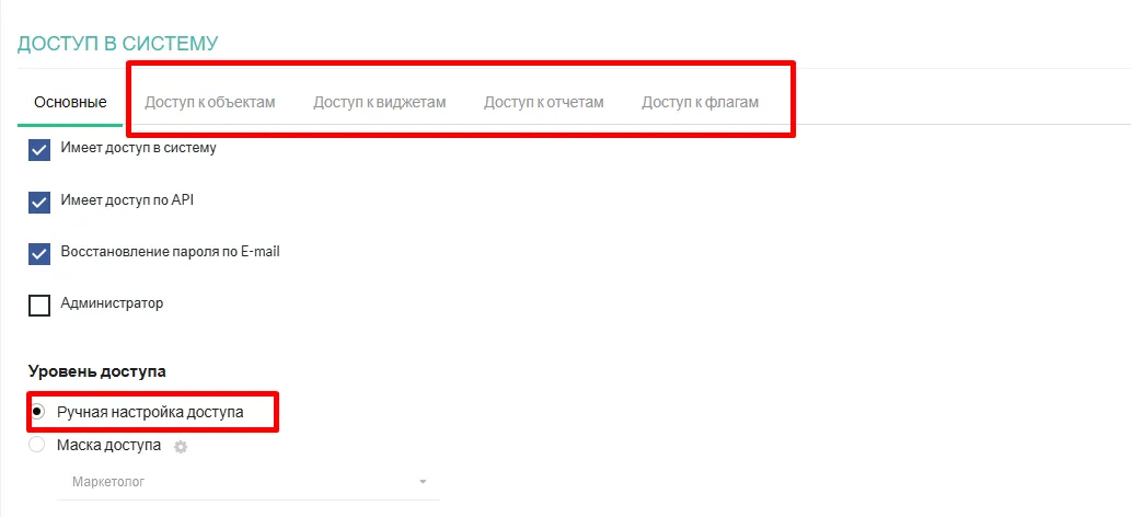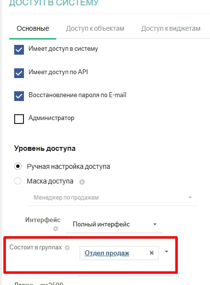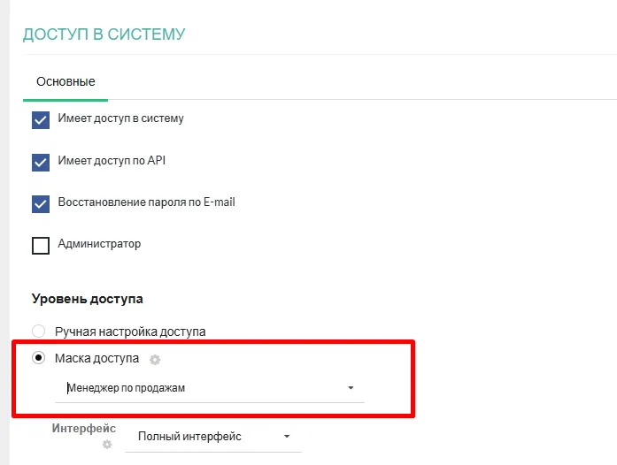 или настроить маску доступа: «Настройки» → «Маски доступа» и присвоить «Маску доступа» в карточке «Пользователя»: