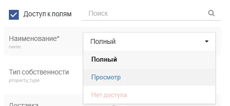 Найдя нужный пункт меню можно настроить доступ по следующим уровням: