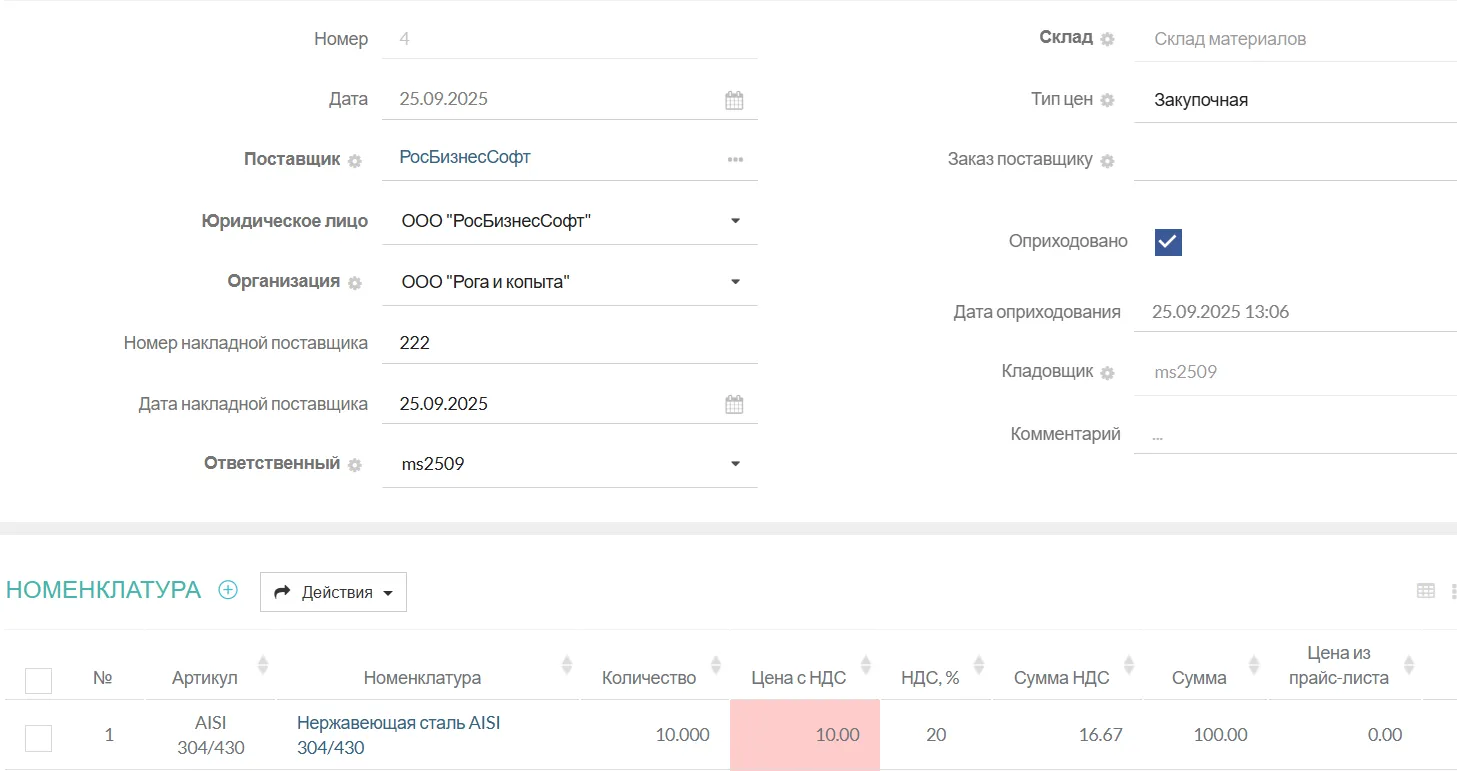 Этот элемент служит для дополнительного контроля со стороны кладовщика или материально ответственного лица. При установке этого флажка система автоматически записывает дату, время и пользователя, который подтвердил оприходование. Это является электронной отметкой о том, что ТМЦ физически поступили на склад и приняты.