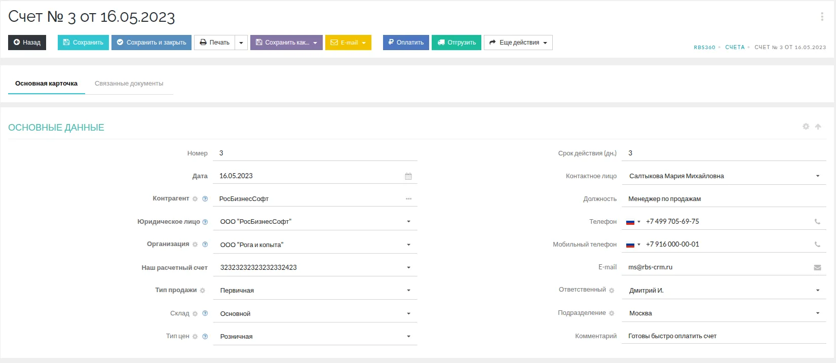 Сам модуль «Счета» выступает не просто генератором документа, а объектом для запуска ключевых операционных процессов компании, обеспечивая сквозную эффективность от продажи до отгрузки.