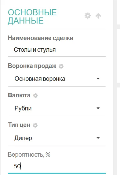 Вероятность выполнения (%): Позволяет оценить перспективность сделки и спрогнозировать доходы (например, 50% на стадии переговоров, 90% — при согласовании КП).