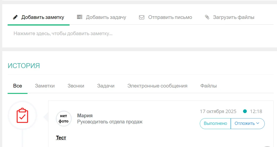 Все коммуникации по Сделки, важные вехи разговоров и другая информация фиксируется в панели «История»: