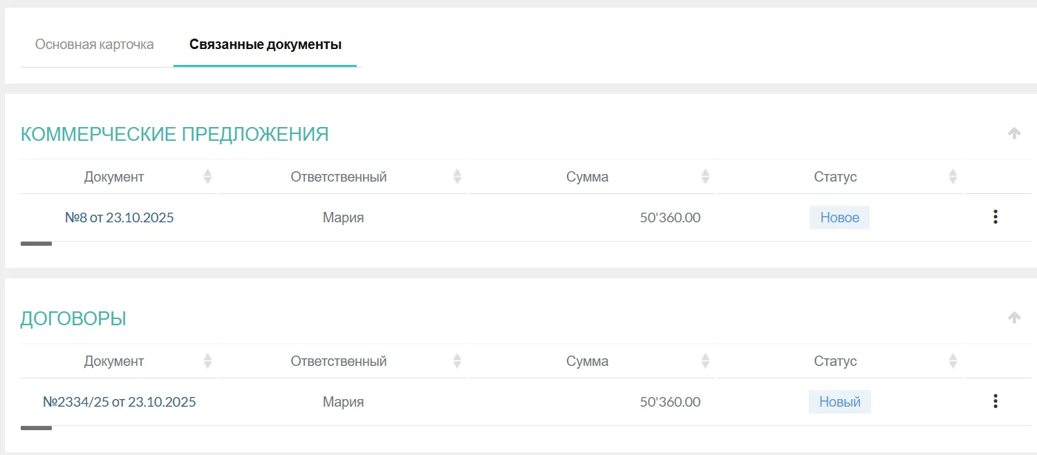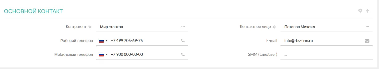 Основной контакт: Основная информация о клиенте и контактном лице автоматически переносится из карточки задачи или контрагента, что исключает дублирование и ошибки.