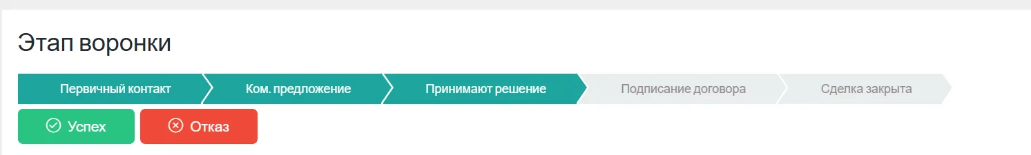 Выбор Воронки продаж: Типы настраиваются администратором в блоке «Настройки» — «Воронки продаж» под нужды бизнеса (например, «Оптовая поставка», «Розничная продажа», «Услуги»).