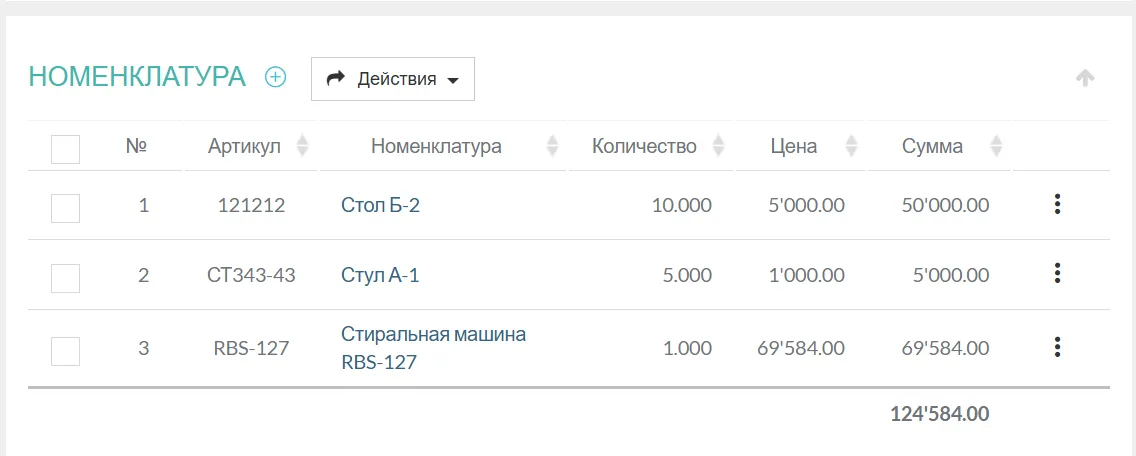 Этот функционал обеспечивает быстрый и безошибочный процесс добавления товаров, услуг или материалов благодаря удобному подбору из справочника «Номенклатуры». Цены подставляются из карточки «Номенклатуры» согласно выбранному «Типу цены» или могут задаваться в ручную.