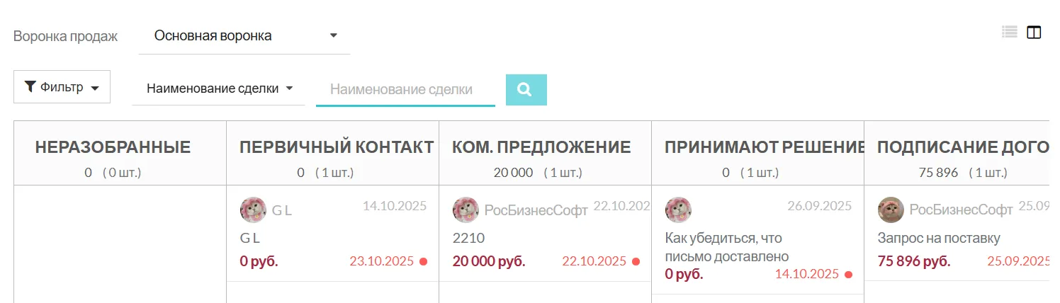 Модуль «Сделки» превращает разрозненные контакты и задачи в структурированный коммерческий pipeline. Он позволяет не только фиксировать договорённости, но и активно управлять ими, автоматизируя рутину и обеспечивая согласованную работу всей команды для успешного закрытия сделки.