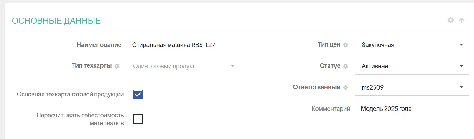 - Основная техкарта — автоматически подставляется в «Заказ на производство» для выбранной продукции (работает для типа «Один готовый продукт»)